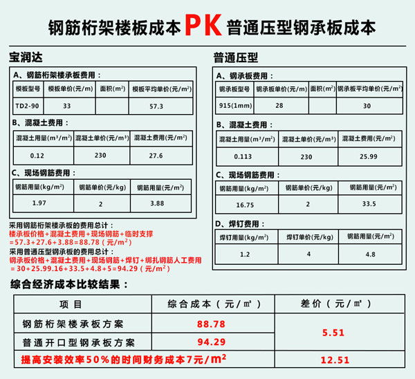 沒(méi)有調(diào)查就沒(méi)有發(fā)言權(quán),寶潤(rùn)達(dá)鋼筋桁架樓承板事業(yè)部,對(duì)鋼筋桁架樓承板的施工成本與傳統(tǒng)的桁架樓承板施工成本,做過(guò)將近20次的成本PK核算。沒(méi)有任何一次數(shù)據(jù)出現(xiàn)反差,全部都是鋼筋桁架樓承板勝出。