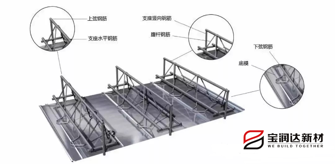 但是由于鋼結(jié)構(gòu)廠(chǎng)房有大量的鋼結(jié)構(gòu)需要在施工現(xiàn)場(chǎng)進(jìn)行吊裝、焊接、登高作業(yè),針對(duì)于這些方面的安全需求,寶潤(rùn)達(dá)以深耕鋼結(jié)構(gòu)行業(yè)多年的經(jīng)驗(yàn)與技術(shù),在傳統(tǒng)壓型樓承板的基礎(chǔ)上實(shí)行改進(jìn),將樓板中的鋼筋在工廠(chǎng)加工成鋼筋桁架,并將鋼筋桁架與鍍鋅壓型鋼板焊接成一體的組合模板,制成了新型鋼筋桁架樓承板。