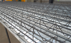 鋼筋桁架樓承板無支撐壓型組合樓承板的一種。鋼筋桁架是在后臺加工場定型加工,現場施工需要先將壓型板使用栓釘固定在鋼梁上,再放置鋼筋桁架進行綁扎,驗收后澆筑混凝土。